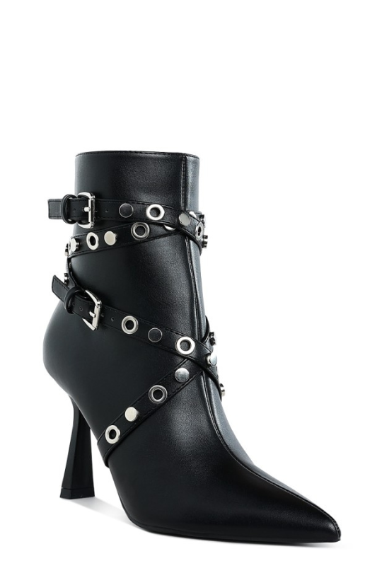 Las botas tienen un estilo vanguardista y atrevido, con su elegante detalle de tiras, que realza la estética de las botas de aguja. El fino tacón acampanado añade un toque intrigante y divertido que combina a la perfección con la silueta de las botas. Las suaves plantillas acolchadas son cómodas, mientras que el cierre de cremallera facilita su uso.