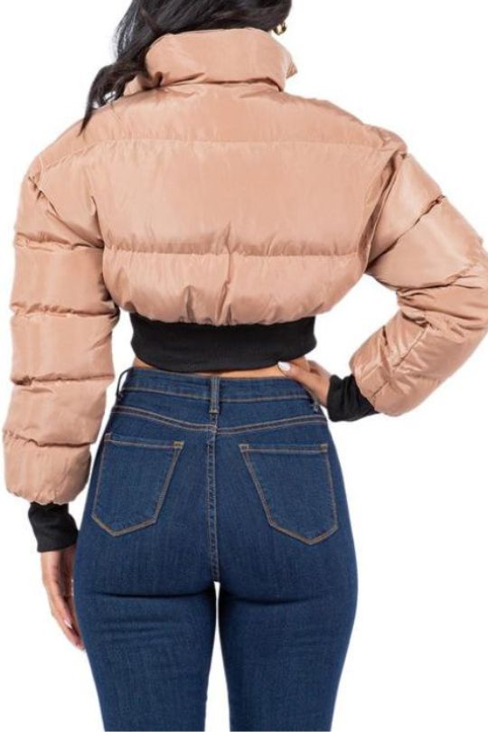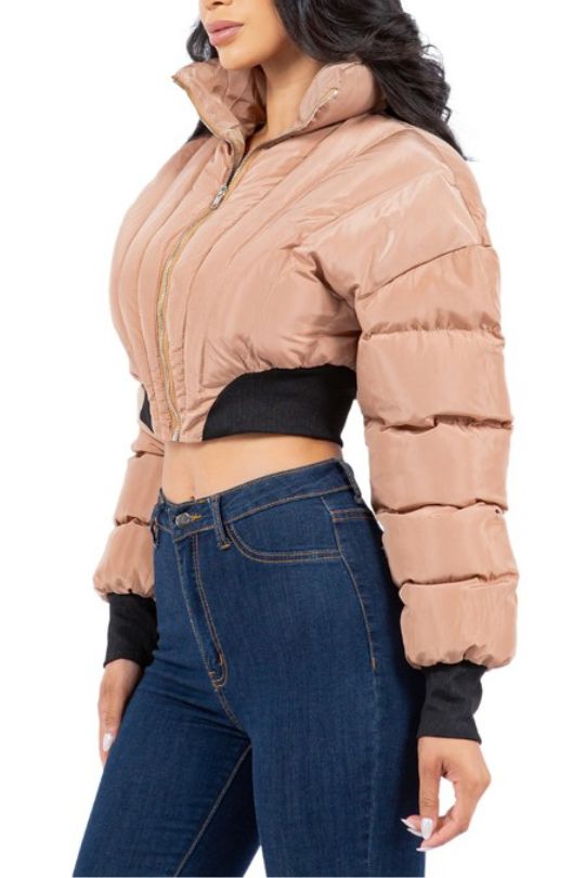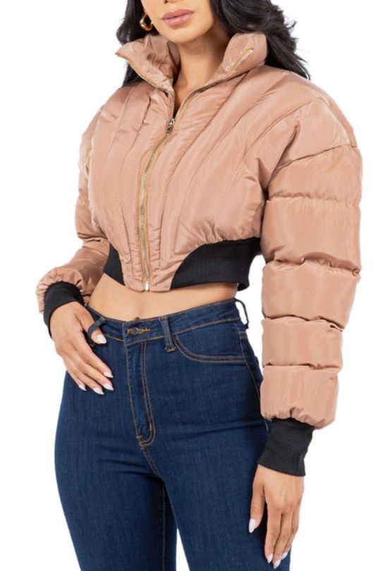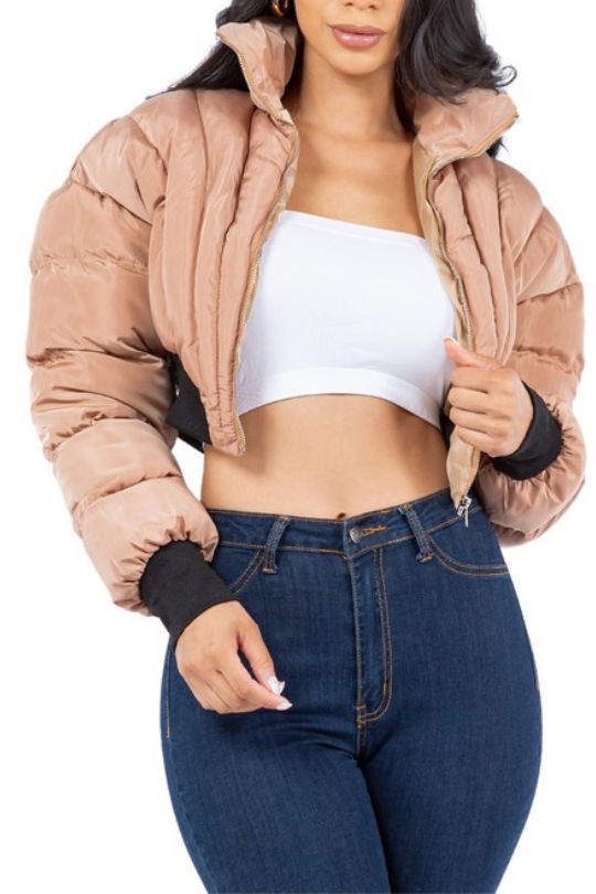 Experience the ultimate chicness and comfort with our Cropped Long Sleeve Puffer Jacket. Designed with a soft down feel, oversized collar, and a stylish zipper front closure, our jacket will elevate your style and keep you warm all winter long.
