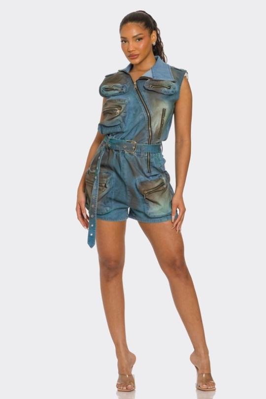Step up your street-style game with the Elemental Urban Edge Zipper Utility Romper, a bold fusion of edgy design and effortless cool. Crafted in a unique ombre-wash denim, this sleeveless romper features an asymmetrical zip-front closure and multiple zippered utility pockets for a rugged, moto-inspired look. The cinched waist with a statement belt enhances your silhouette, while the relaxed-fit shorts add comfort and movement.