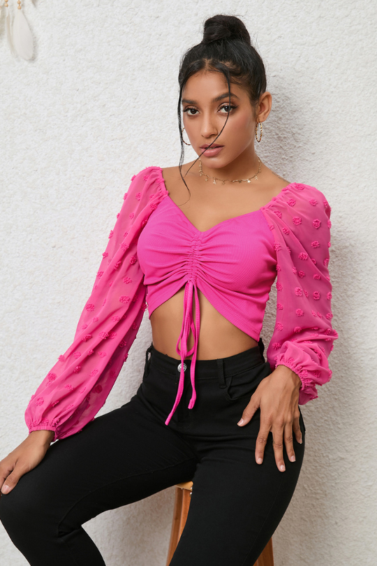 Hot Pink Swiss Dot Drawstring Cropped Blouse