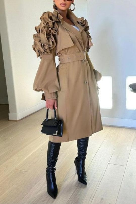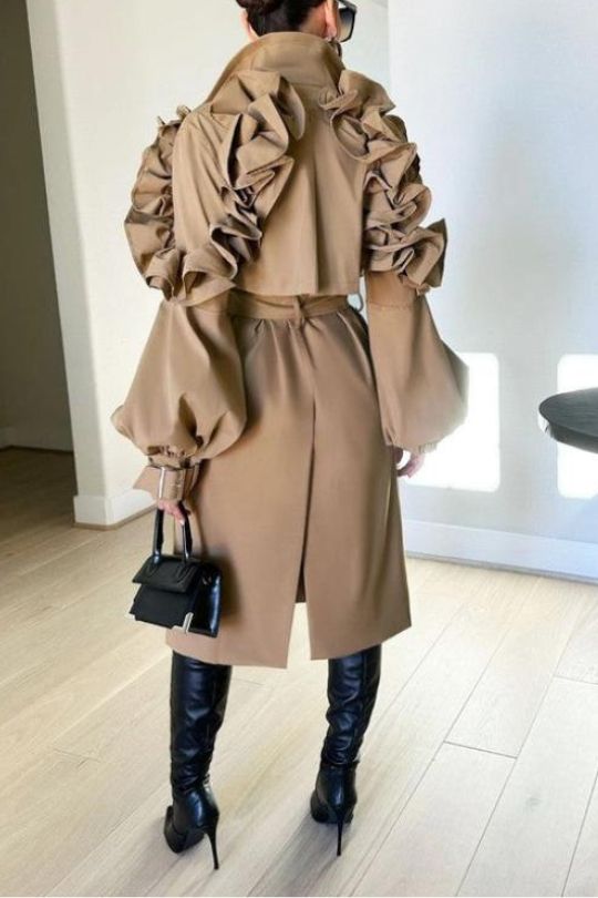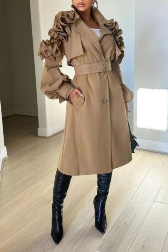 - Graceful Ruffle Floral Sleeves – A delicate touch that elevates the classic trench silhouette.