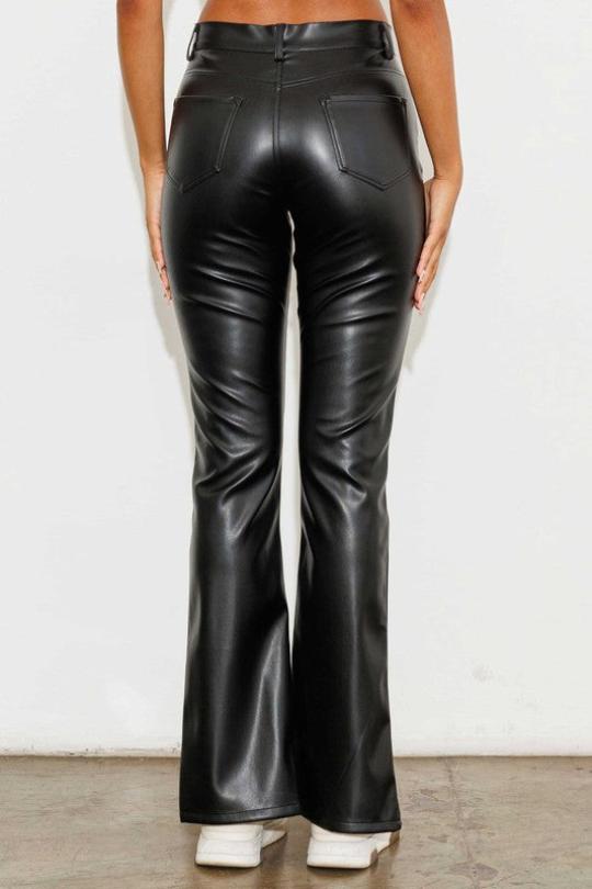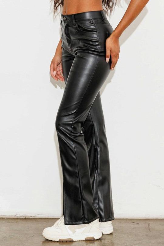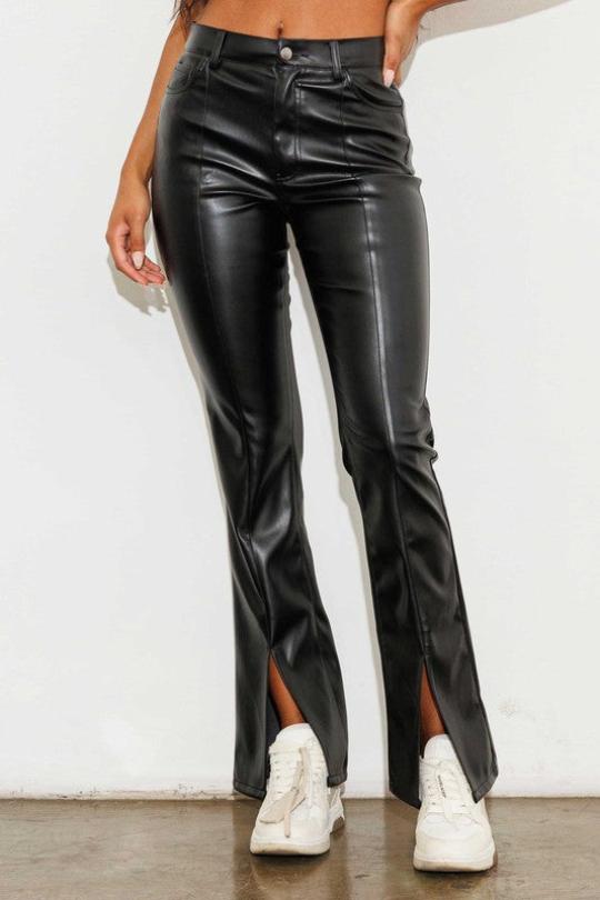 Unleash your inner rocker with these edgy Bootcut Pants in 100% vegan leather. Made for the bold, these fitted pants contour to perfection and feature a striking front slit at the hem for a style that stands out. The long-length bootcut design pairs flawlessly with your favorite statement heels or classic boots, while the zip fly closure ensures a sleek look. Imported with a soft stretch fabric for comfort, they’re machine washable for low-maintenance care. Take on the night and redefine cool in these killer pants that never compromise on comfort or style.