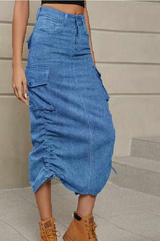 Ruched Drawstring Denim Midi Skirt