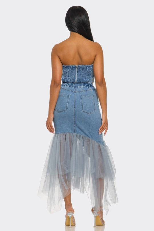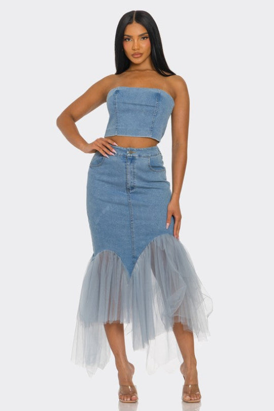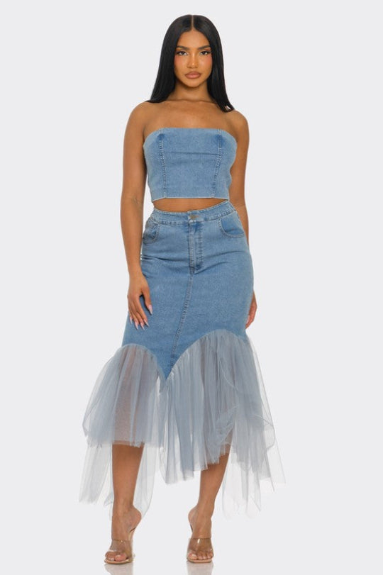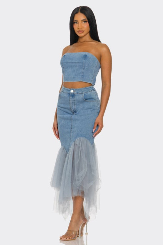 Dare to own the spotlight. This sexy two-piece set features a sleek denim crop top with a zip-back closure and a statement midi skirt detailed with soft tulle for an edgy twist. Front button and zipper accents add attitude, while the sleeveless cut keeps it effortlessly cool. From rooftop parties to nights out, this set is your go-to for unstoppable style.
