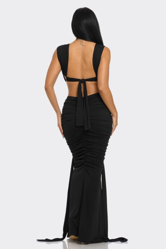 Step into a world of desert-inspired elegance with the Winds of Time Full Length Cocktail Dress. This breathtaking ensemble merges avant-garde design with timeless sophistication. The gown features a unique pleated bodice with fabric cups connected by circular accents, creating a perfect balance of structure and fluidity. The pleating continues down the gown, culminating in a dramatic floor-sweeping train that moves with ethereal grace.