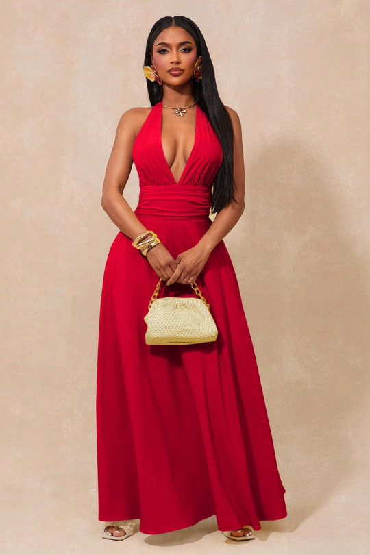 Float into every special moment wearing the Women’s Backless Flowing Princess Dress, a striking silhouette designed to captivate from every angle. Featuring a halter neckline and elegant backless design, this dress highlights the shoulders while the ruched detailing enhances your shape. The high-waisted A-line cut flows into a flared hem, creating soft movement that feels effortlessly romantic—perfect for evenings, celebrations, and unforgettable entrances.