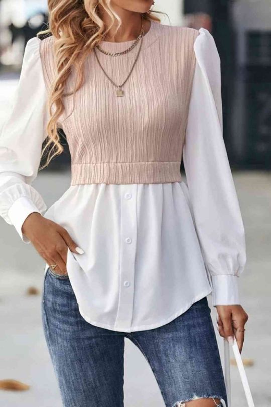This sweater is made from 100% polyester, and it's comfy to wear. It's got a casual fit blouse, long sleeves, and a puff shoulder. The sweater length is cropped, and the fabric is warm and opaque. This combination Top has low maintenance care. To wash it, just throw it in the washing machine inside out on cold and tumble dry on low.