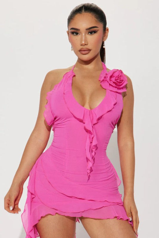 Bring the heat in the Women's Salsa Night Mini Dress — a show-stopping piece made to move with you. Featuring a daring plunge neckline, dramatic shoulder rose, and lace tassel detailing, this sleeveless mini turns every entrance into a moment. The open back, halter neck strip, and side zipper add both allure and ease. Finished with a multilayered skirt, it's perfect for twirling the night away in true salsa style.