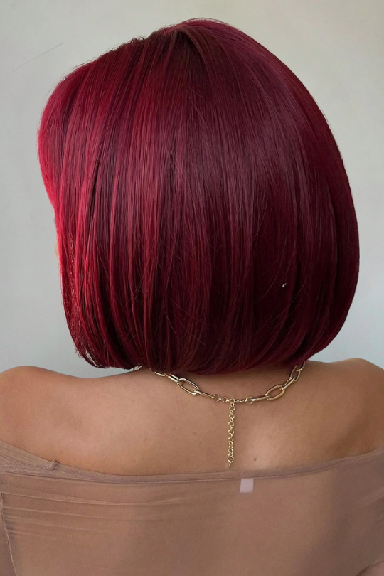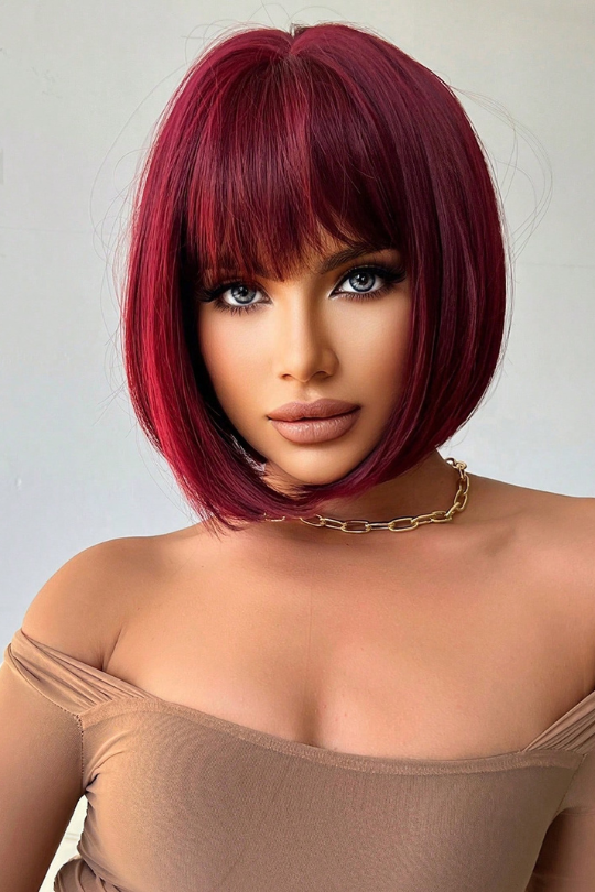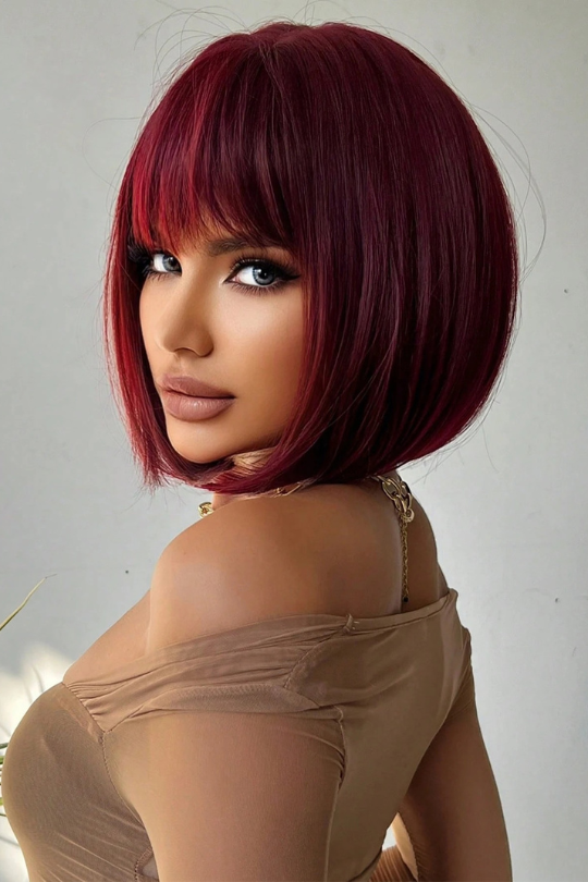 - Vibrant burgundy color with full bangs